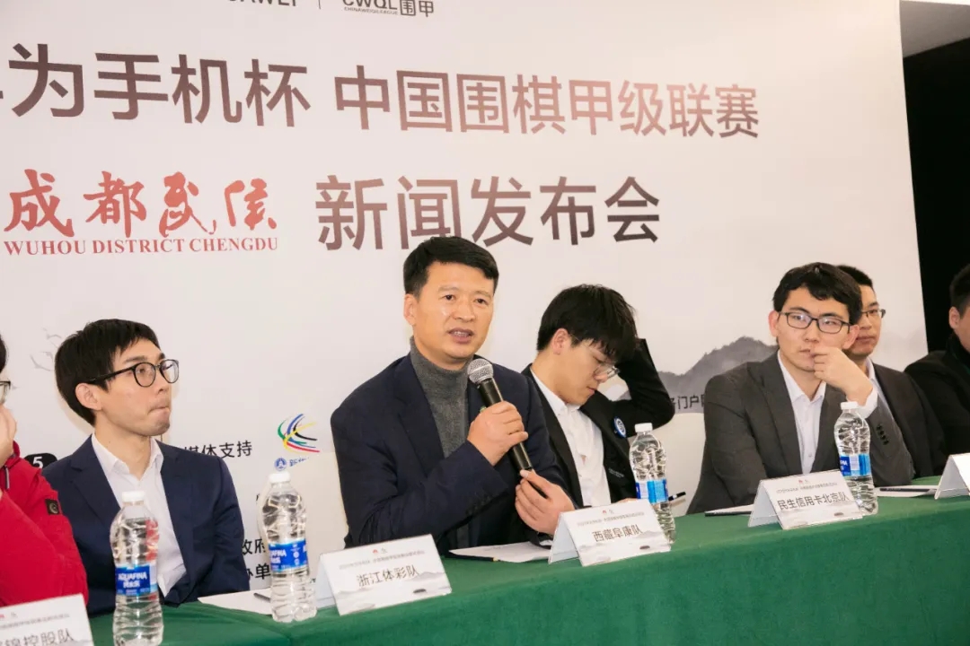 7日晚,2020華為手機杯中國圍棋甲級聯(lián)賽第二階段成都武侯分站賽第十輪賽后發(fā)布會于成都東方美豪麗致酒店舉行。中國圍棋協(xié)會副主席、棋圣聶衛(wèi)平,中國圍棋協(xié)會副主席、國家圍棋隊總領隊華學明及第十輪勝出的八支棋隊的代表出席了發(fā)布會。拉薩棋院院長、西藏自治區(qū)圍棋協(xié)會主席、西藏阜康隊領隊王斌出席會議并代表發(fā)言。